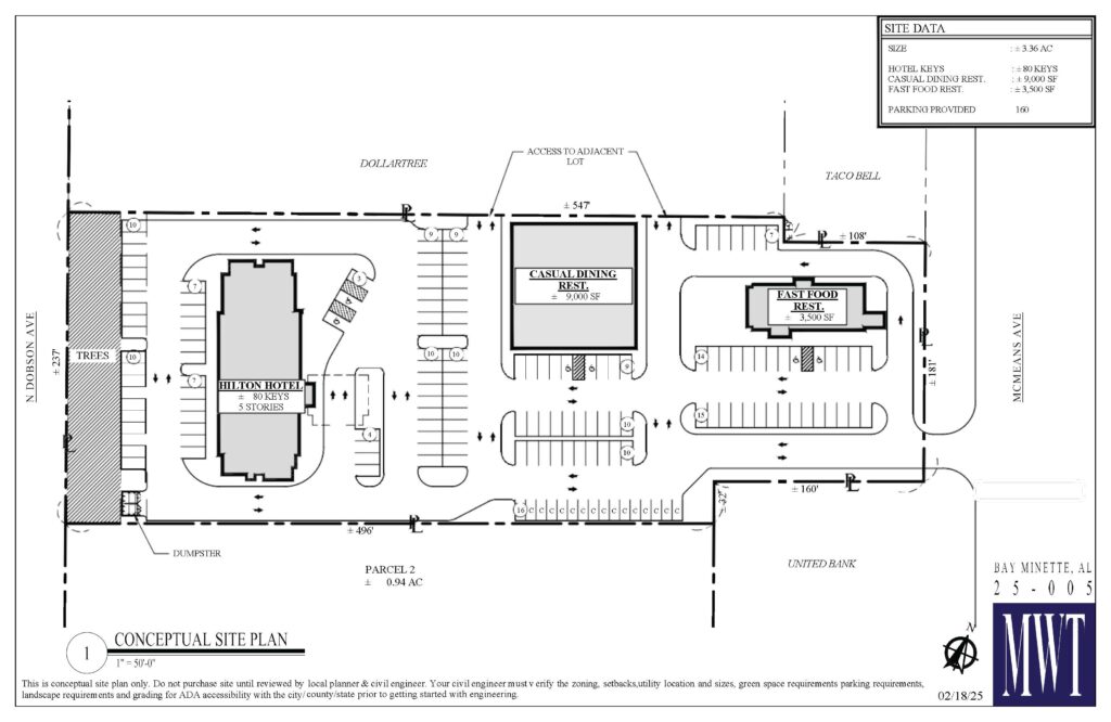 This project is a direct response to the momentum of the City of Bay Minette and the rising demand for accommodations and amenities created by recent major announcements, including Novelis’ aluminum plant, Big Mike’s Steakhouse, and the upcoming Cobblestone Hotel.